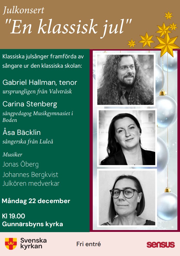 Kom och upplev julstämning de luxe genom att vara med på “En klassiks jul” i Gunnarsbyns kyrka. Vi inleder med glöggmingel och brasa utanför kyrkan och sedan går vi in i värmen och tänder ljus, lyssnar på musik och njuter. För tsång står Gabriel Hallman, Carina Stenberg, Åsa Bäcklin samt Gunnarsbykören och toner från musiken Jonas Öberg och Johannes Bergqvist. Välkomna in!