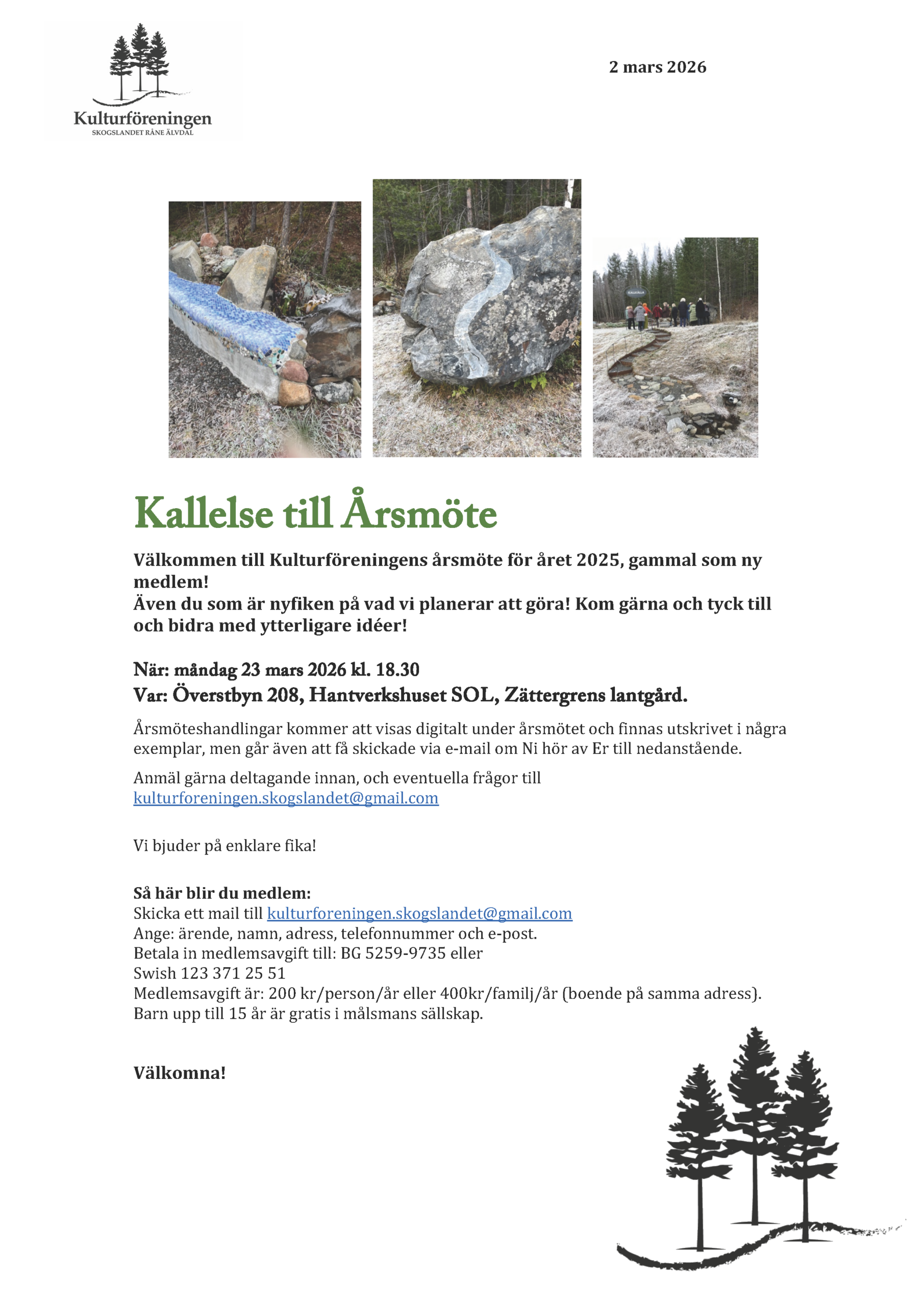 Anmäl gärna deltagande innan, och eventuella frågor till kulturforeningen.skogslandet@gmail.com
