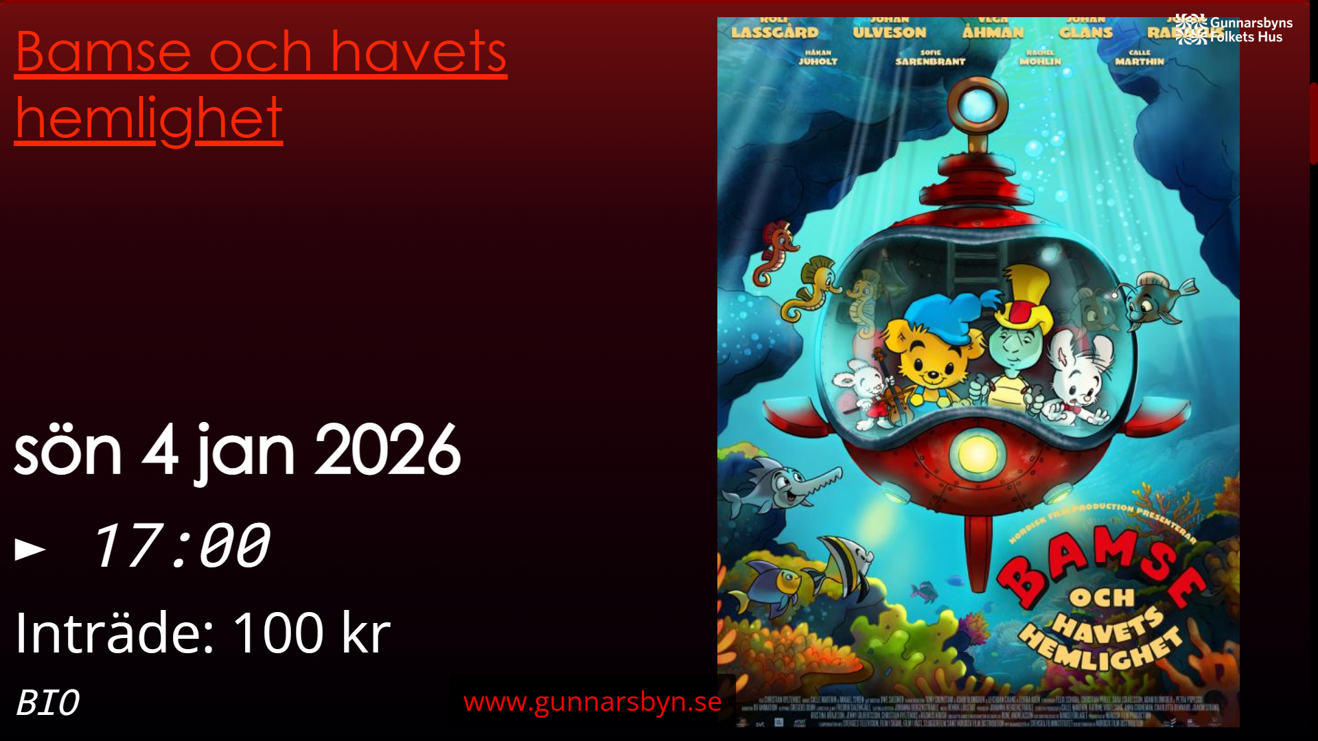 Bio: Bamse och havets hemligheter Inträde: 100 kr Se hela programmet på https://www.gunnarsbyn.se/ + Lägg till i Google Kalender + iCal / Outlook export 00 dagar 00 timmar 00 minuter 00 sekunder Datum 04 jan 2026 Tid 17:00 Platser Folkets Hus, Gunnarsbyn Gunnarsbyn Arrangör Folkets Hus Gunnarsbyn E-post fhgbyn@gmail.com Webbplats https://www.facebook.com/folketshusgunnarsbyn Dela det här evenemanget