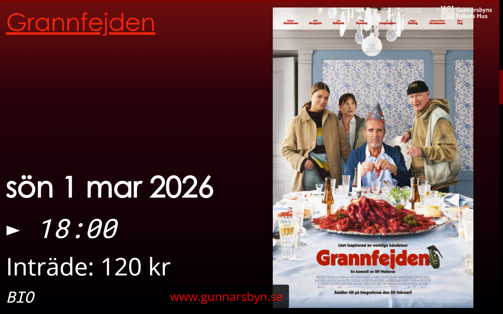 Bio: Grannfejden Inträde: 120 kr Se hela programmet på https://www.gunnarsbyn.se/ + Lägg till i Google Kalender + iCal / Outlook export 00 dagar 00 timmar 00 minuter 00 sekunder Datum 01 mar 2026 Tid 18:00 Platser Folkets Hus, Gunnarsbyn Gunnarsbyn Dela det här evenemanget