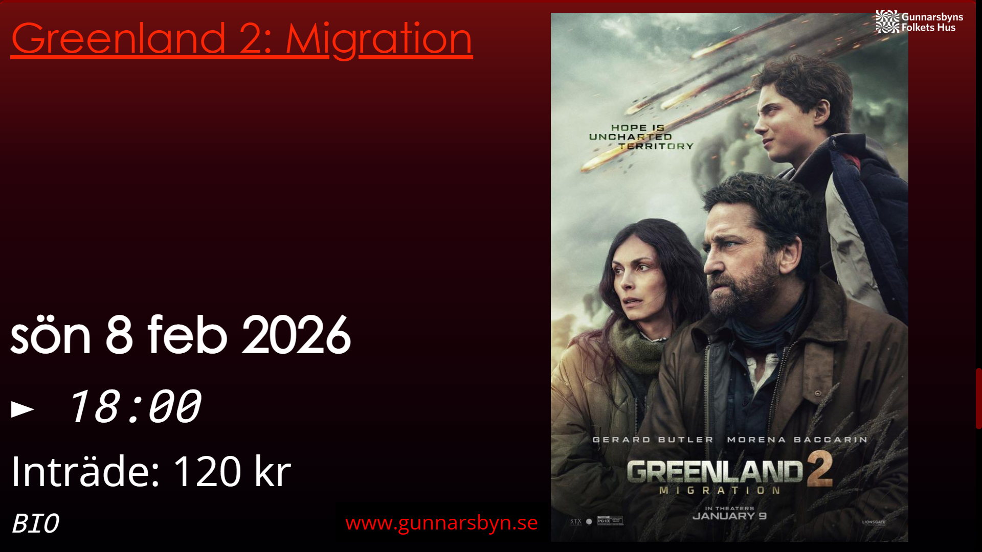 Bio: Greenland 2: Migration Inträde: 120 kr Se hela programmet på https://www.gunnarsbyn.se/ + Lägg till i Google Kalender + iCal / Outlook export 00 dagar 00 timmar 00 minuter 00 sekunder Datum 08 feb 2026 Tid 18:00 Platser Folkets Hus, Gunnarsbyn Gunnarsbyn Arrangör Folkets Hus Gunnarsbyn E-post fhgbyn@gmail.com Webbplats https://www.facebook.com/folketshusgunnarsbyn Dela det här evenemanget