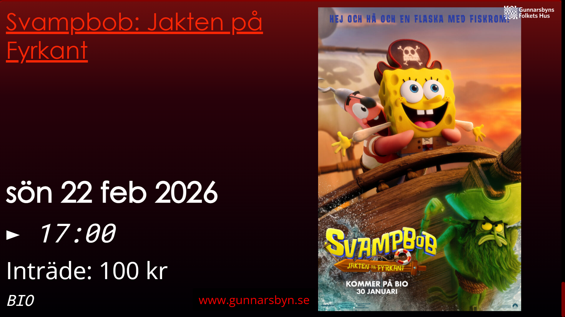 Bio: Svampbod: Jakten på Fyrkant Inträde: 100 kr Se hela programmet på https://www.gunnarsbyn.se/ + Lägg till i Google Kalender + iCal / Outlook export 00 dagar 00 timmar 00 minuter 00 sekunder Datum 22 feb 2026 Tid 17:00 Platser Folkets Hus, Gunnarsbyn Gunnarsbyn Arrangör Folkets Hus Gunnarsbyn E-post fhgbyn@gmail.com Webbplats https://www.facebook.com/folketshusgunnarsbyn Dela det här evenemanget