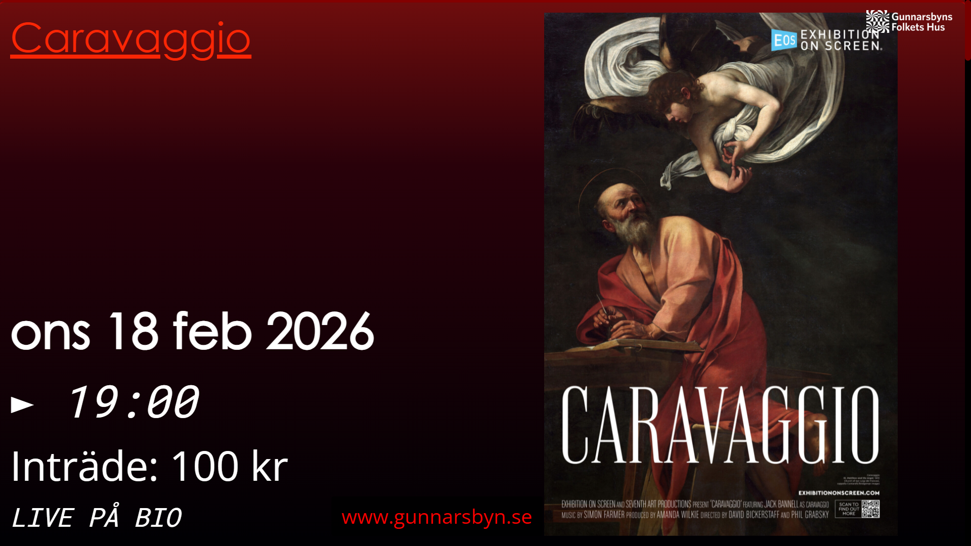 Caravaggio Inträde: 100 kr Se hela programmet på https://www.gunnarsbyn.se/ + Lägg till i Google Kalender + iCal / Outlook export 00 dagar 00 timmar 00 minuter 00 sekunder Datum 18 feb 2026 Tid 19:00 Platser Folkets Hus, Gunnarsbyn Gunnarsbyn Arrangör Folkets Hus Gunnarsbyn E-post fhgbyn@gmail.com Webbplats https://www.facebook.com/folketshusgunnarsbyn Dela det här evenemanget