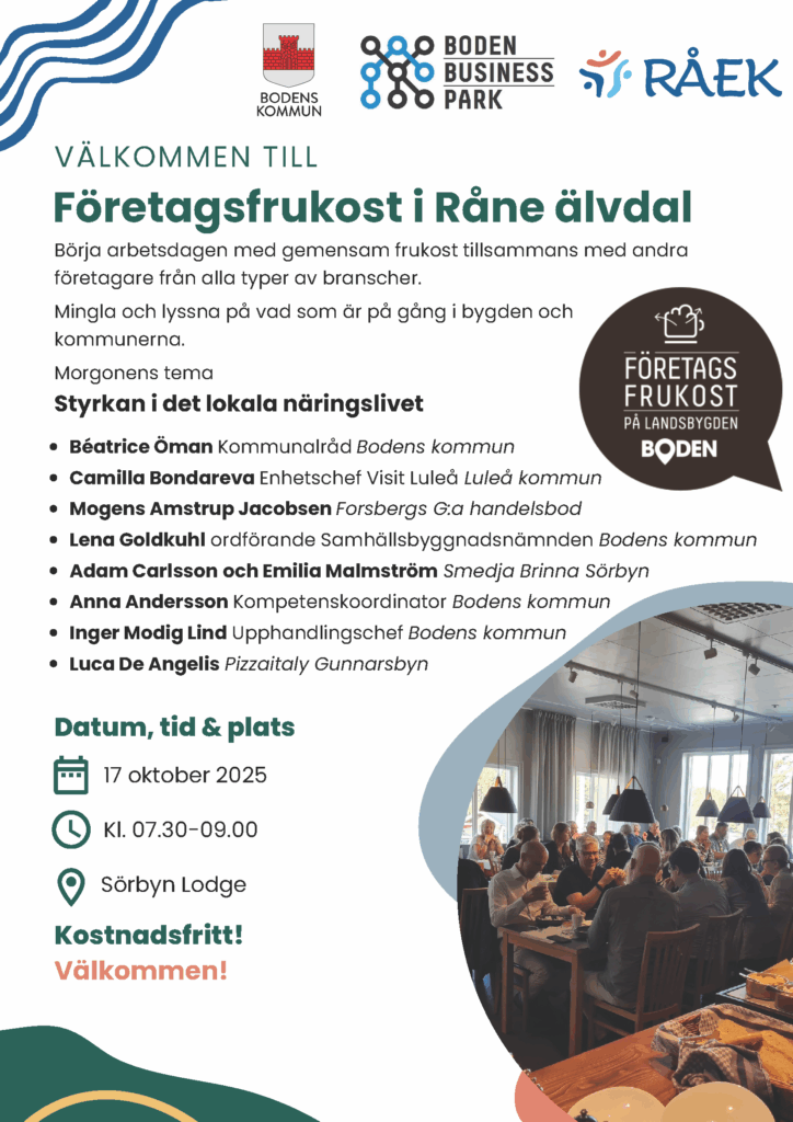 Välkomna till företags frukost i Sörbyn som arrangeras i samarbete mellan Råek, Boden Business Park och Bodens kommun.