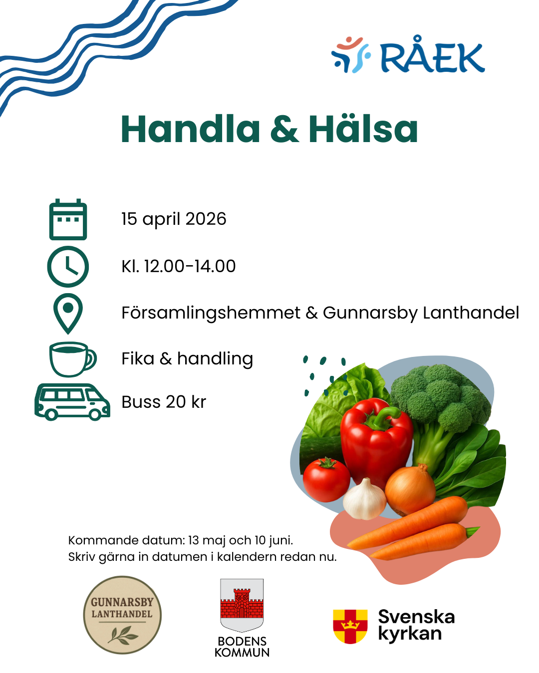 Vi fortsätter fram till sommaren att träffas onsdagar en gång i månaden för gemenskap, fika och möjlighet att handla tillsammans. Vi träffas på Församlingshemmet för fika och går därefter över till Gunnarsby Lanthandel för att handla.